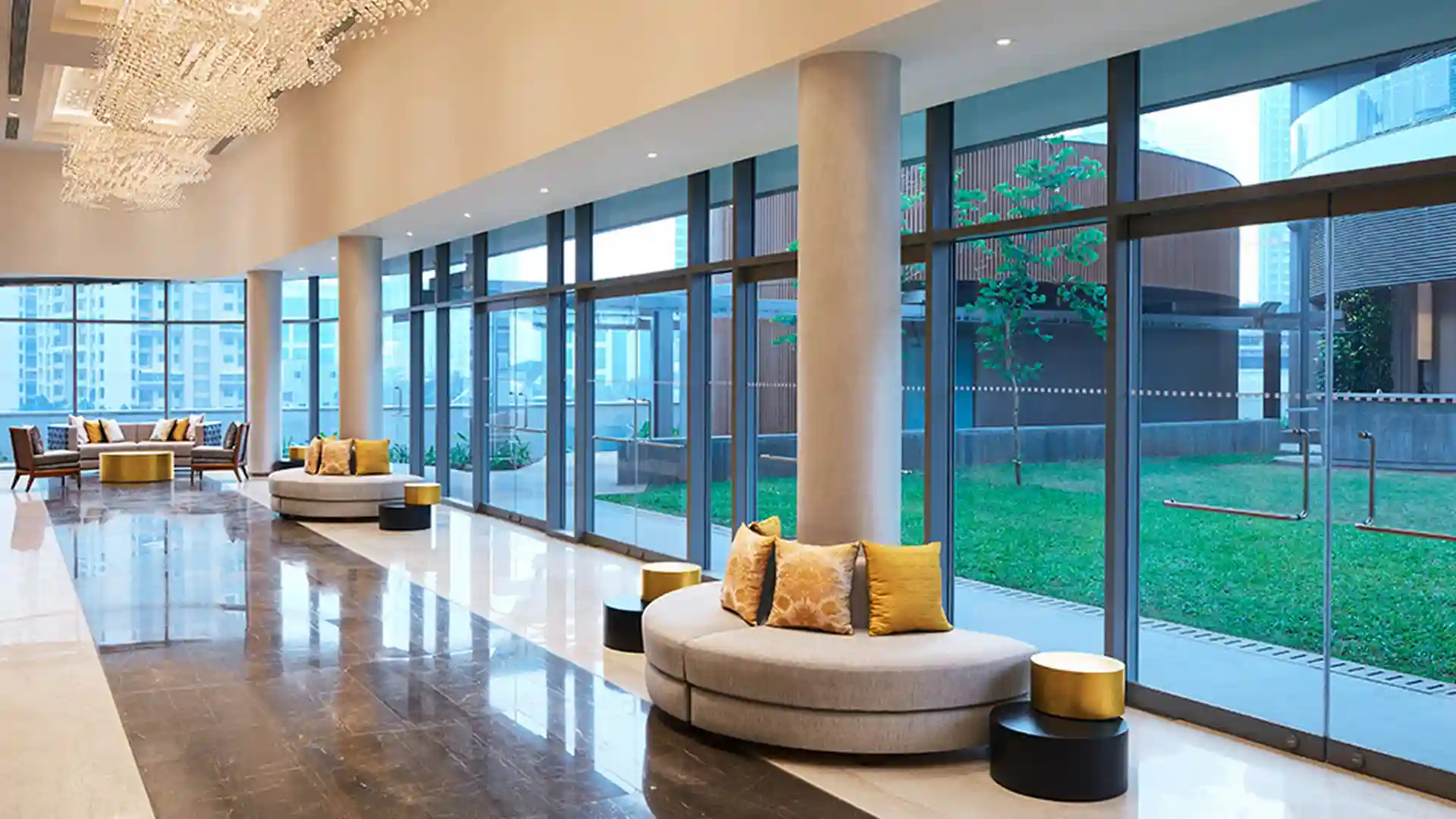 A gate that's 250 ft. wide – larger than the Gateway of India – marks the entrance to the iconic towers. Drive past lush hedges and low walls to a landscaped 100,000 sq. ft. central court where spectacular dancing fountains welcome you to a world of unparalleled grandeur. Your car whispers to a halt, and you step into a sumptuous reception lobby. The entrance to The World Towers is grand and spectacular, as befits a true icon.